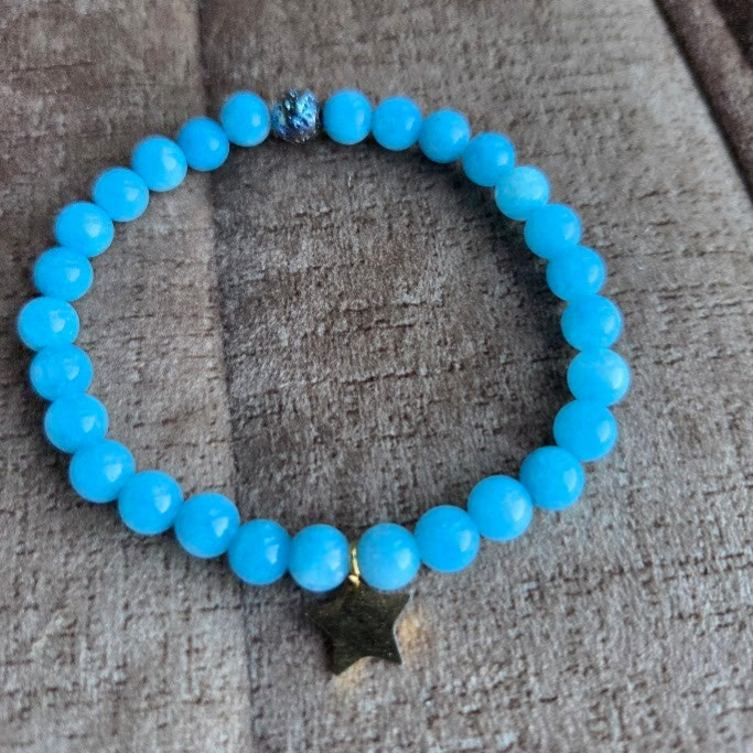 6mm. de mooie blauwe Aquamarijn parel met een gouden ster. doet denken aan de lucht en wie belangrijk is voor ons.